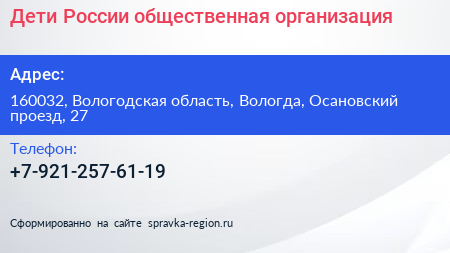 Дети России, общественная организация по адресу 160032, Вологодская область, Вологда, Осановский проезд, 27 в дальнейшем Организация, размещена в следующих категориях: