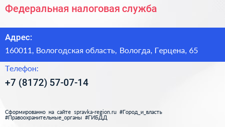 Федеральная налоговая служба по адресу 160011, Вологодская область, Вологда, Герцена, 65 в дальнейшем Организация, размещена в следующих категориях: