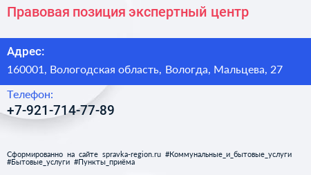 Правовая позиция, экспертный центр по адресу 160001, Вологодская область, Вологда, Мальцева, 27 в дальнейшем Организация, размещена в следующих категориях: