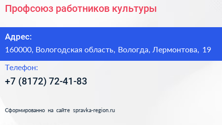 Профсоюз работников культуры по адресу 160000, Вологодская область, Вологда, Лермонтова, 19 в дальнейшем Организация, размещена в следующих категориях: