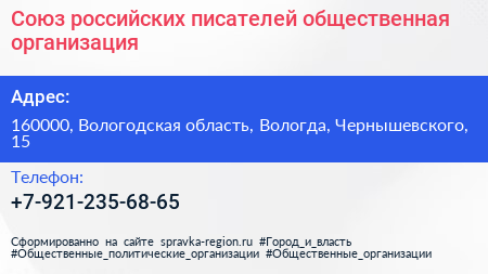 Союз российских писателей, общественная организация по адресу 160000, Вологодская область, Вологда, Чернышевского, 15 в дальнейшем Организация, размещена в следующих категориях: