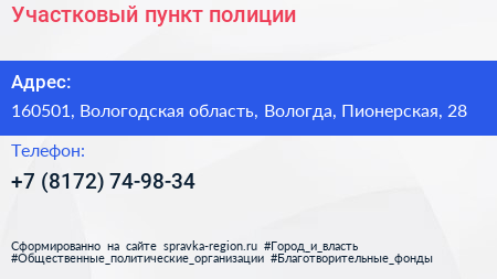 Участковый пункт полиции по адресу 160501, Вологодская область, Вологда, Пионерская, 28 в дальнейшем Организация, размещена в следующих категориях:
