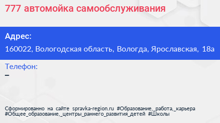 777, автомойка самообслуживания по адресу 160022, Вологодская область, Вологда, Ярославская, 18а в дальнейшем Организация, размещена в следующих категориях: