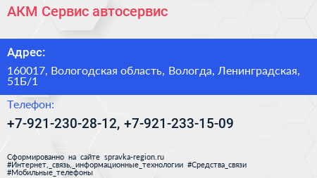 АКМ-Сервис, автосервис по адресу 160017, Вологодская область, Вологда, Ленинградская, 51Б/1 в дальнейшем Организация, размещена в следующих категориях: