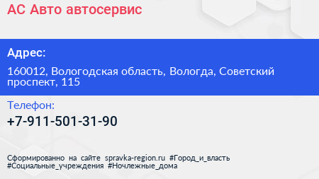 АС-Авто, автосервис по адресу 160012, Вологодская область, Вологда, Советский проспект, 115 в дальнейшем Организация, размещена в следующих категориях: