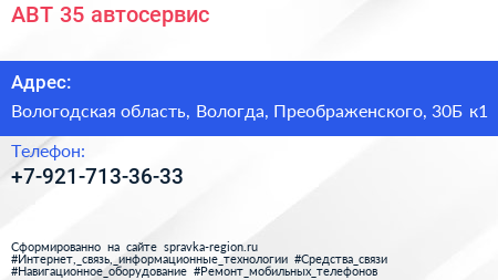 АВТ 35, автосервис по адресу Вологодская область, Вологда, Преображенского, 30Б к1 в дальнейшем Организация, размещена в следующих категориях: