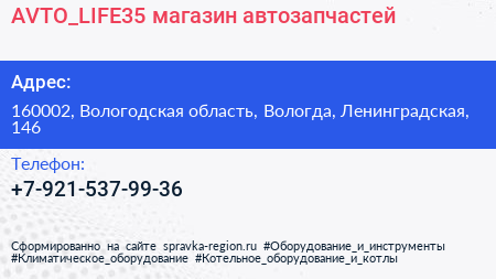 AVTO_LIFE35, магазин автозапчастей по адресу 160002, Вологодская область, Вологда, Ленинградская, 146 в дальнейшем Организация, размещена в следующих категориях: