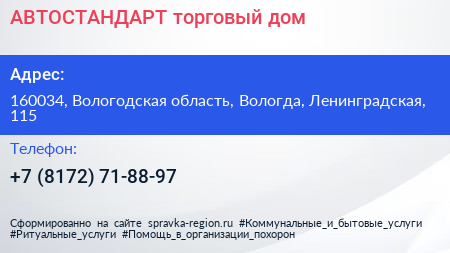 АВТОСТАНДАРТ, торговый дом по адресу 160034, Вологодская область, Вологда, Ленинградская, 115 в дальнейшем Организация, размещена в следующих категориях: