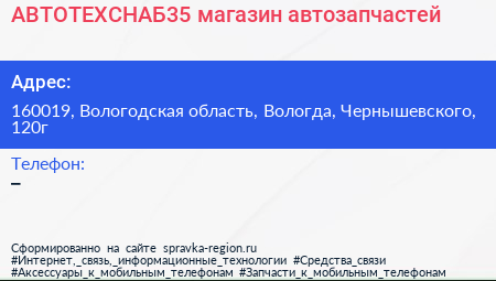 АВТОТЕХСНАБ35, магазин автозапчастей по адресу 160019, Вологодская область, Вологда, Чернышевского, 120г в дальнейшем Организация, размещена в следующих категориях: