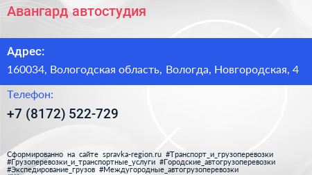Авангард, автостудия по адресу 160034, Вологодская область, Вологда, Новгородская, 4 в дальнейшем Организация, размещена в следующих категориях: