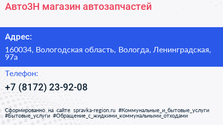 Авто3Н, магазин автозапчастей по адресу 160034, Вологодская область, Вологда, Ленинградская, 97а в дальнейшем Организация, размещена в следующих категориях:
