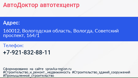 АвтоДоктор, автотехцентр по адресу 160012, Вологодская область, Вологда, Советский проспект, 164/1 в дальнейшем Организация, размещена в следующих категориях: