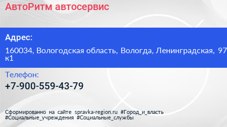 АвтоРитм, автосервис по адресу 160034, Вологодская область, Вологда, Ленинградская, 97 к1 в дальнейшем Организация, размещена в следующих категориях: