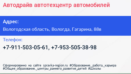 Автодрайв, автотехцентр автомобилей по адресу Вологодская область, Вологда, Гагарина, 88в в дальнейшем Организация, размещена в следующих категориях: