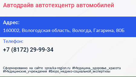 Автодрайв, автотехцентр автомобилей по адресу 160002, Вологодская область, Вологда, Гагарина, 80Б в дальнейшем Организация, размещена в следующих категориях: