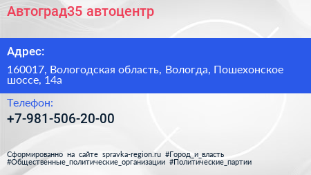 Автоград35, автоцентр по адресу 160017, Вологодская область, Вологда, Пошехонское шоссе, 14а в дальнейшем Организация, размещена в следующих категориях: