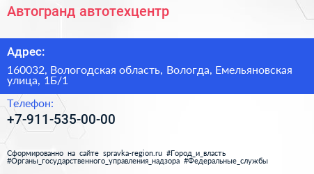 Автогранд, автотехцентр по адресу 160032, Вологодская область, Вологда, Емельяновская улица, 1Б/1 в дальнейшем Организация, размещена в следующих категориях: