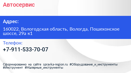 Автосервис по адресу 160022, Вологодская область, Вологда, Пошехонское шоссе, 29а к1 в дальнейшем Организация, размещена в следующих категориях:
