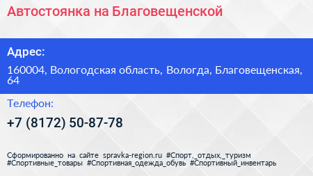 Автостоянка на Благовещенской по адресу 160004, Вологодская область, Вологда, Благовещенская, 64 в дальнейшем Организация, размещена в следующих категориях: