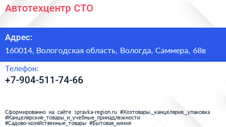 Автотехцентр, СТО по адресу 160014, Вологодская область, Вологда, Саммера, 68в в дальнейшем Организация, размещена в следующих категориях: