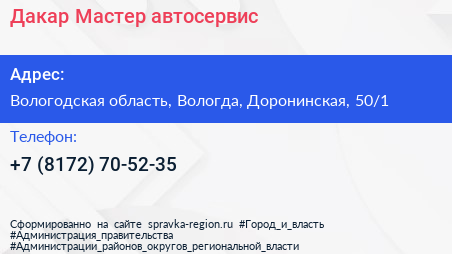 Дакар Мастер, автосервис по адресу Вологодская область, Вологда, Доронинская, 50/1 в дальнейшем Организация, размещена в следующих категориях: