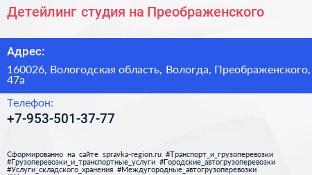 Детейлинг-студия на Преображенского по адресу 160026, Вологодская область, Вологда, Преображенского, 47а в дальнейшем Организация, размещена в следующих категориях: