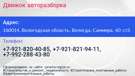 Движок, авторазборка по адресу 160014, Вологодская область, Вологда, Саммера, 60 ст3 в дальнейшем Организация, размещена в следующих категориях: