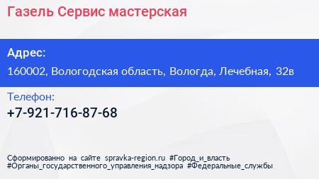 Газель Сервис, мастерская по адресу 160002, Вологодская область, Вологда, Лечебная, 32в в дальнейшем Организация, размещена в следующих категориях: