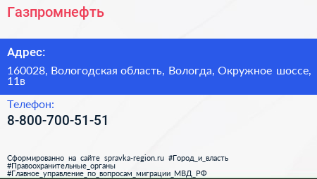 Газпромнефть по адресу 160028, Вологодская область, Вологда, Окружное шоссе, 11в в дальнейшем Организация, размещена в следующих категориях: