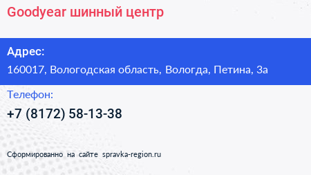 Goodyear, шинный центр по адресу 160017, Вологодская область, Вологда, Петина, 3а в дальнейшем Организация, размещена в следующих категориях: