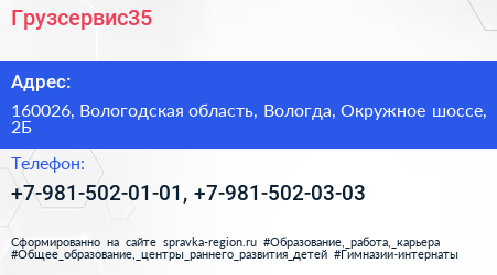 Грузсервис35 по адресу 160026, Вологодская область, Вологда, Окружное шоссе, 2Б в дальнейшем Организация, размещена в следующих категориях: