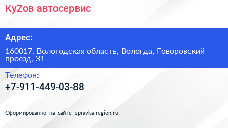 КуZов, автосервис по адресу 160017, Вологодская область, Вологда, Говоровский проезд, 31 в дальнейшем Организация, размещена в следующих категориях: