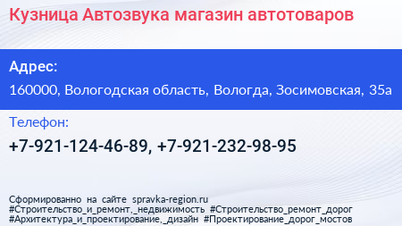 Кузница Автозвука, магазин автотоваров по адресу 160000, Вологодская область, Вологда, Зосимовская, 35а в дальнейшем Организация, размещена в следующих категориях: