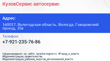 КузовСервис, автосервис по адресу 160017, Вологодская область, Вологда, Говоровский проезд, 35в в дальнейшем Организация, размещена в следующих категориях: