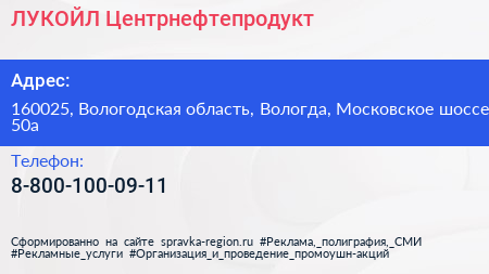 ЛУКОЙЛ-Центрнефтепродукт по адресу 160025, Вологодская область, Вологда, Московское шоссе, 50а в дальнейшем Организация, размещена в следующих категориях: