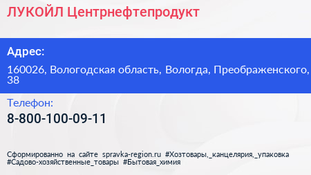 ЛУКОЙЛ-Центрнефтепродукт по адресу 160026, Вологодская область, Вологда, Преображенского, 38 в дальнейшем Организация, размещена в следующих категориях: