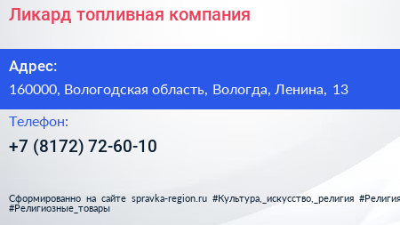 Ликард, топливная компания по адресу 160000, Вологодская область, Вологда, Ленина, 13 в дальнейшем Организация, размещена в следующих категориях: