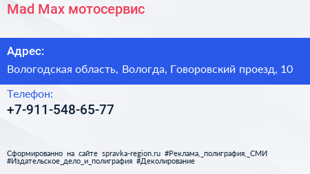 Mad Max, мотосервис по адресу Вологодская область, Вологда, Говоровский проезд, 10 в дальнейшем Организация, размещена в следующих категориях: