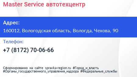 Master Service, автотехцентр по адресу 160012, Вологодская область, Вологда, Чехова, 90 в дальнейшем Организация, размещена в следующих категориях: