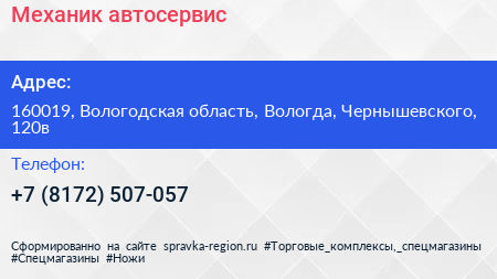 Механик, автосервис по адресу 160019, Вологодская область, Вологда, Чернышевского, 120в в дальнейшем Организация, размещена в следующих категориях: