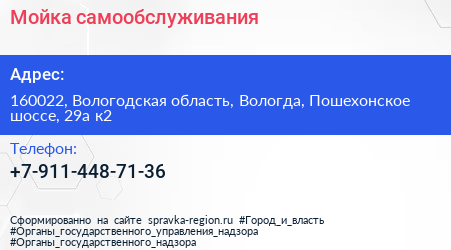 Мойка самообслуживания по адресу 160022, Вологодская область, Вологда, Пошехонское шоссе, 29а к2 в дальнейшем Организация, размещена в следующих категориях: