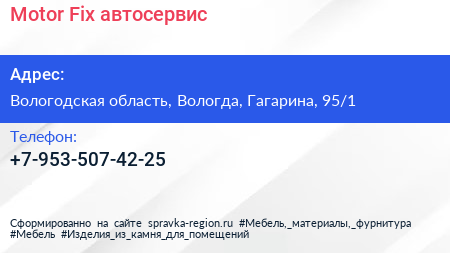 Motor Fix, автосервис по адресу Вологодская область, Вологда, Гагарина, 95/1 в дальнейшем Организация, размещена в следующих категориях: