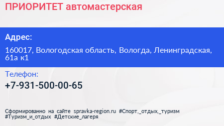ПРИОРИТЕТ, автомастерская по адресу 160017, Вологодская область, Вологда, Ленинградская, 61а к1 в дальнейшем Организация, размещена в следующих категориях:
