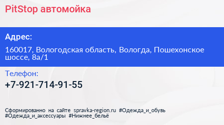 PitStop, автомойка по адресу 160017, Вологодская область, Вологда, Пошехонское шоссе, 8а/1 в дальнейшем Организация, размещена в следующих категориях: