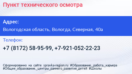 Пункт технического осмотра по адресу Вологодская область, Вологда, Северная, 40а в дальнейшем Организация, размещена в следующих категориях: