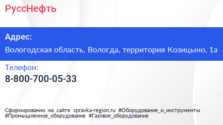 РуссНефть по адресу Вологодская область, Вологда, территория Козицыно, 1а в дальнейшем Организация, размещена в следующих категориях:
