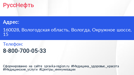 РуссНефть по адресу 160028, Вологодская область, Вологда, Окружное шоссе, 15 в дальнейшем Организация, размещена в следующих категориях: