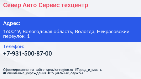 Север-Авто-Сервис, техцентр по адресу 160019, Вологодская область, Вологда, Некрасовский переулок, 1 в дальнейшем Организация, размещена в следующих категориях: