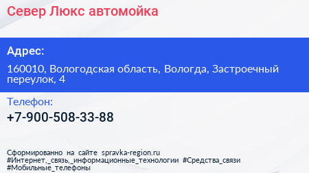 Север Люкс, автомойка по адресу 160010, Вологодская область, Вологда, Застроечный переулок, 4 в дальнейшем Организация, размещена в следующих категориях: