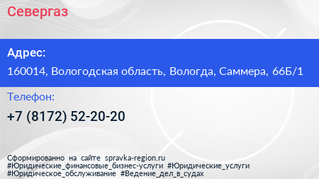 Севергаз по адресу 160014, Вологодская область, Вологда, Саммера, 66Б/1 в дальнейшем Организация, размещена в следующих категориях: